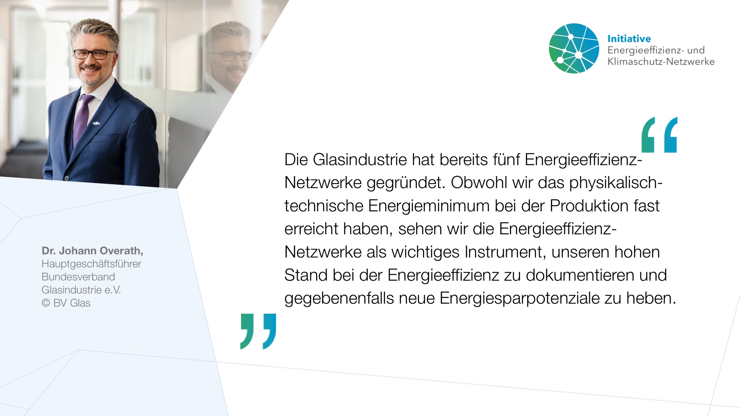 Der Bundesverband Glasindustrie ist der Netzwerkinitiative als einer der ersten Verbände beigetreten und hat seit dem Start fünf Netzwerke an den Start gebracht, zwei von ihnen begleitet er als Moderator. Die Glasindustrie hat die meisten Energieeinsparpotenziale schon gehoben, durch den Austausch in den Netzwerken werden die letzten Stellschrauben noch gedreht. Dabei können die beteiligten Unternehmen über den eigenen Tellerrand schauen und sich gegenseitig Anregungen zur Energieeffizienz holen.
