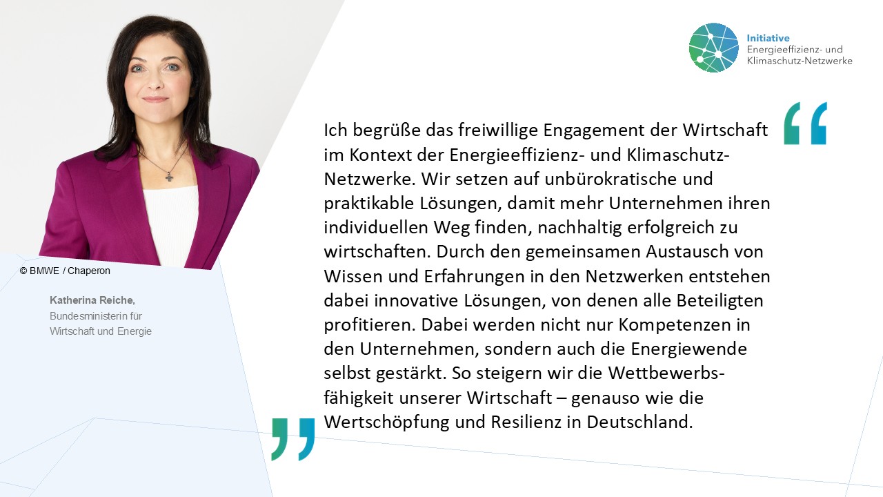 Wir freuen uns über die Unterstützung der Bundesregierung. Bundesministerin für Wirtschaft und Energie Katherina Reiche und Bundesminister für Umwelt, Klimaschutz, Naturschutz und nukleare Sicherheit Carsten Schneider würdigen die Leistung der Initiative und unterstreichen die Bedeutung von Netzwerken für das wirtschaftliche Wachstum und für ressourcenschonende Produktion.