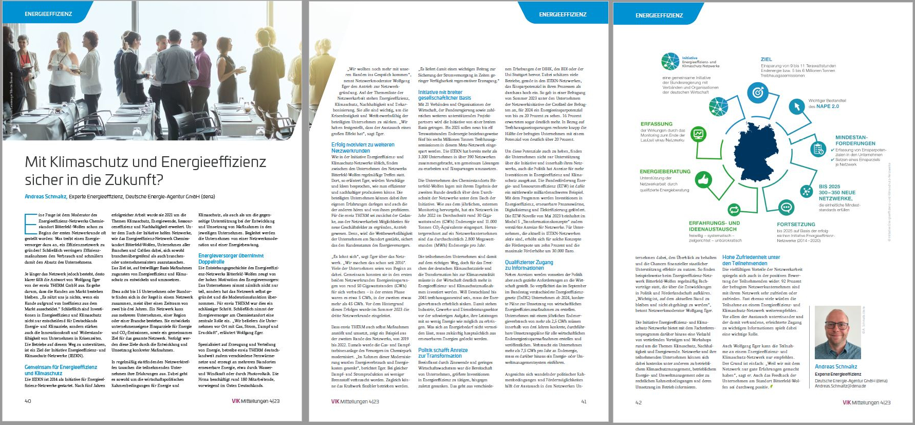 Der Fachartikel zur Netzwerkinitiative in den VIK-Mitteilungen nimmt die erfolgreiche Arbeit des Energieeffizienz-Netzwerks Chemiestandort Bitterfeld-Wolfen zum Anlass, einen aktuellen Blick auf Anforderungen und Chancen der Netzwerkarbeit zu werfen. Unter dem Titel “Mit Klimaschutz und Energieeffizienz sicher in die Zukunft?” werden politische Rahmenbedingungen wie etwa das Energieeffizienzgesetz (EnEfG) ebenso beleuchtet, wie Förderprogramme und Hilfestellungen durch die Initiative.