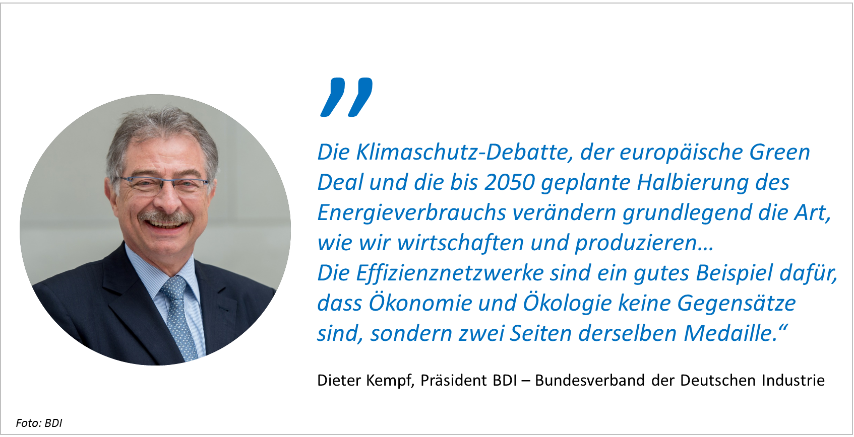 Die Klimaschutz-Debatte, der europäische Green Deal und die bis 2050 geplante Halbierung des Energieverbrauchs verändern grundlegend die Art, wie wir wirtschaften und produzieren. Eine der größten Herausforderungen für die Wirtschaft liegt darin, den Energieverbrauch stark zu verringern. Die Energiewende wird uns nur mit Energieeffizienz gelingen. Als Industrie wollen wir auch in Zukunft ein Zeichen setzen: Energieeffizienz findet bei uns und unseren Unternehmen in der Praxis statt und genießt eine hohe Priorität. Das Thema Klimaschutz erweitert das Angebot der Initiative und macht sie im politischen Diskurs noch relevanter. Mehr als 24500 Unternehmen sind bereits dabei, haben gemeinsam das CO2-Einsparziel der Initiative erreicht und nebenbei ihre Energiekosten gesenkt. Darauf möchten wir aufbauen und die Energiewende weiter mit praktischer Tatkraft begleiten. Die Effizienznetzwerke sind ein gutes Beispiel dafür, dass Ökonomie und Ökologie keine Gegensätze sind, sondern zwei Seiten derselben Medaille.