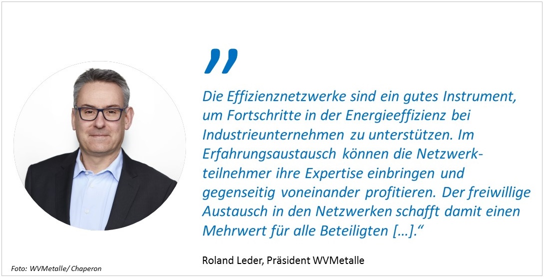 Die Effizienznetzwerke sind ein gutes Instrument, um Fortschritte in der Energieeffizienz bei Industrieunternehmen zu unterstützen. Im Erfahrungsaustausch können die Netzwerkteilnehmer ihre Expertise einbringen und gegenseitig voneinander profitieren. Der freiwillige Austausch in den Netzwerken schafft damit einen Mehrwert für alle Beteiligten und ist der richtige Weg zur Steigerung der Energieeffizienz in der Industrie. Zudem macht die Netzwerkinitiative Fortschritte der Energieeffizienz in der Industrie sichtbar. Aus diesen Gründen unterstütze ich als Präsident der WVMetalle die Netzwerkinitiative.