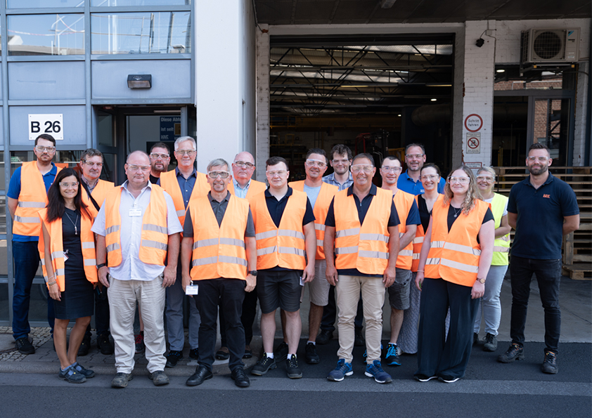 Von links im Bild sehen Sie vor den Produktionshallen der Schmelze: Lukas Seipel (Tadiran Batteries GmbH), Jessica Hickert (Vacuumschmelze GmbH & Co. KG), Heiko Müller (Tadiran Batteries GmbH), Dirk Barenbrügge (Rheinpfalz Verlag & Druckerei GmbH & Co. KG), Marcel Schweitzer (Janitza electronics GmbH), Peter Laumeister und Matthias Krebs (beide KAUP GmbH & Co. KG), Michael Behr (VEA), Dennis Mielke und Markus Knispel (Poppe Elastomertechnik GmbH), Zacharias Klußmann (Vacuumschmelze GmbH & Co. KG), Matthias Kaufmann (Thüringer Papierwarenfabrik C. Schröter GmbH & Co. KG), Oliver Eberle (Rheinpfalz Verlag & Druckerei GmbH & Co. KG), Markus Bröning (Vacuumschmelze GmbH & Co. KG), Katharina Haus (VEA), Pia Ricarda Weber (Rheinpfalz Verlag & Druckerei GmbH & Co. KG), Patricia Borgwardt und Marco Jost (beide Vacuumschmelze GmbH & Co. KG).