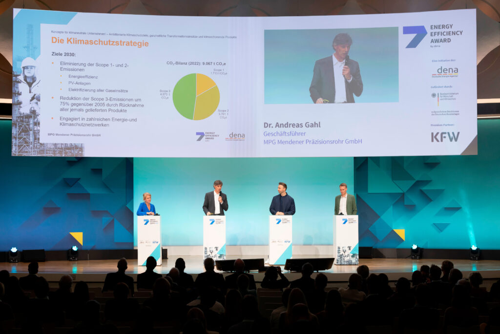 Wir freuen uns besonders, dass vier der nominierten Unternehmen aktive oder ehemalige Teilnehmer der Netzwerkinitiative sind. Auch den live vergebenen Publikumspreis hat in diesem Jahr mit der MPG Mendener Präzisionsrohr GmbH ein Netzwerkunternehmen gewonnen. Die ambitionierte Klimaschutzstrategie von MPG hat die Zuschauer überzeugt: Mit der Rücknahme von gelieferten Produkten, zum Beispiel Wärmetauscherrohren, trägt das mittelständische Unternehmen zur Schließung von Stoffkreisläufen bei. MPG ist Teil des Mendener Effizienznetzwerkes 2 im Sauerland.