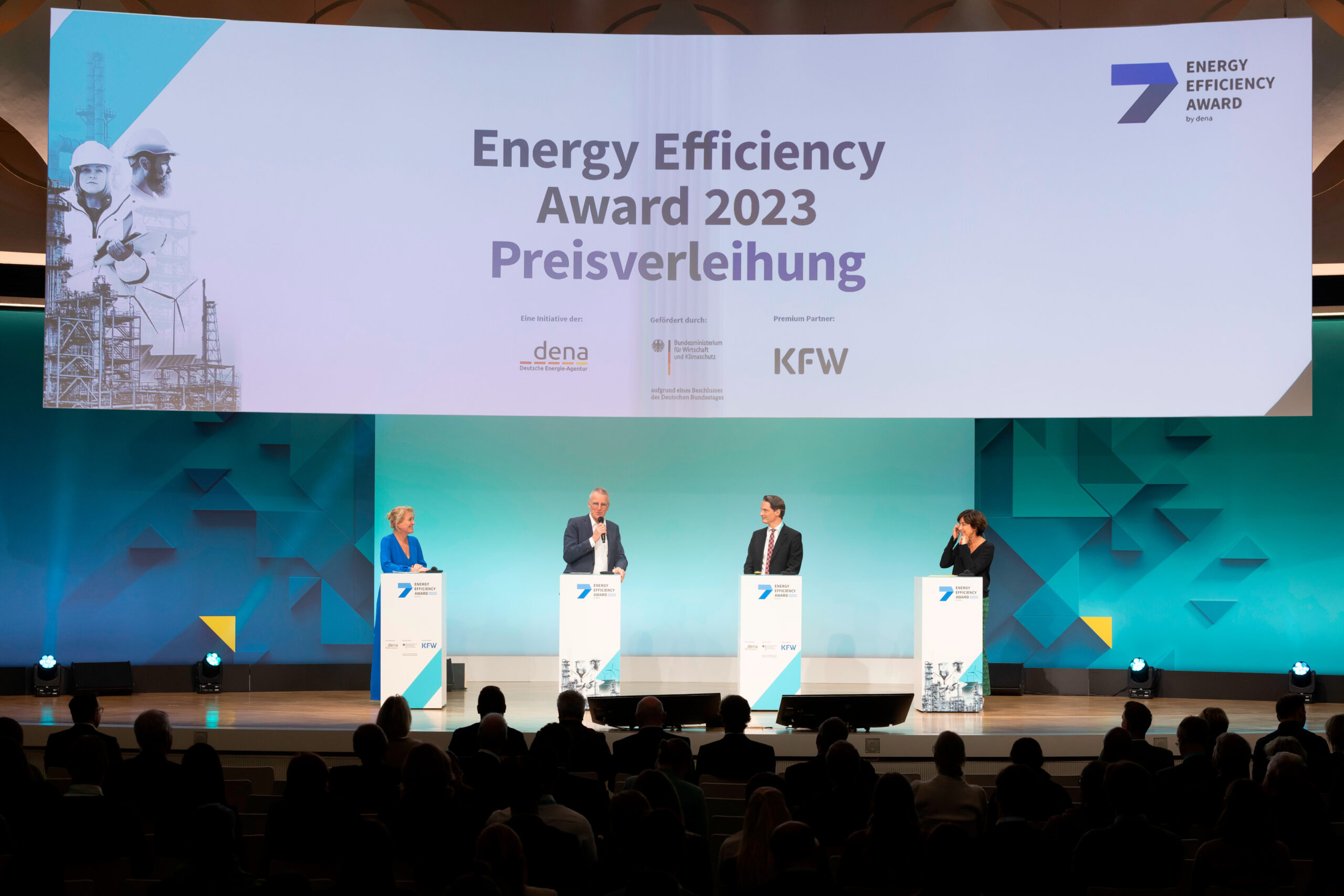 Der vom BMWK geförderte Energy Efficiency Award wird von der dena vergeben und ist mit insgesamt 30.000 Euro dotiert. Prämiert werden Projekte zur Energie- und CO2-Einsparung sowie Konzepte, die den Weg in die Klimaneutralität und die Transformation der Industrie aufzeigen. Traditionell findet die Preisverleihung während des dena Energiewende-Kongresses statt. Auf dem Kongress war auch die Netzwerkinitiative mit einem Informationsstand vertreten, um sich mit den Gästen auszutauschen und über die Netzwerkarbeit zu informieren.